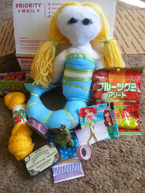 I also sent her a small mermaid pouch to hold her new swap cards, vintage yarn that reminded me of mermaid hair (too bad I didn't find the yarn before I made the doll's hair), some candies, and a cute dragon ornament that met at Cost Plus World Market and knew needed to go live with my partner.